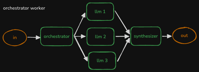 - “orchestrator worker” - complex tasks are broken down into smaller tasks, and the “orchestrator” llm decides which worker llm to use for each task. again, a synthesizer llm is used to combine the results