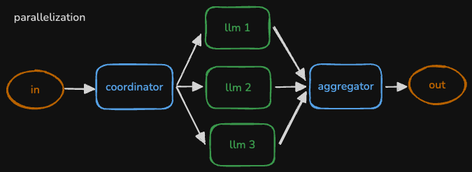 - “parallelization” - the calls are sent to multiple llms in parallel, and we then aggregate the results. note how we are using python code at the ends, hence the different color