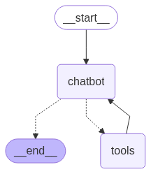 from langgraph.prebuilt import tools_condition graph_builder.add_conditional_edges( "chatbot", tools_condition, "tools") graph_builder.add_edge("tools", "chatbot") graph_builder.add_edge(START, "chatbot") graph_builder.add_edge("chatbot", END)