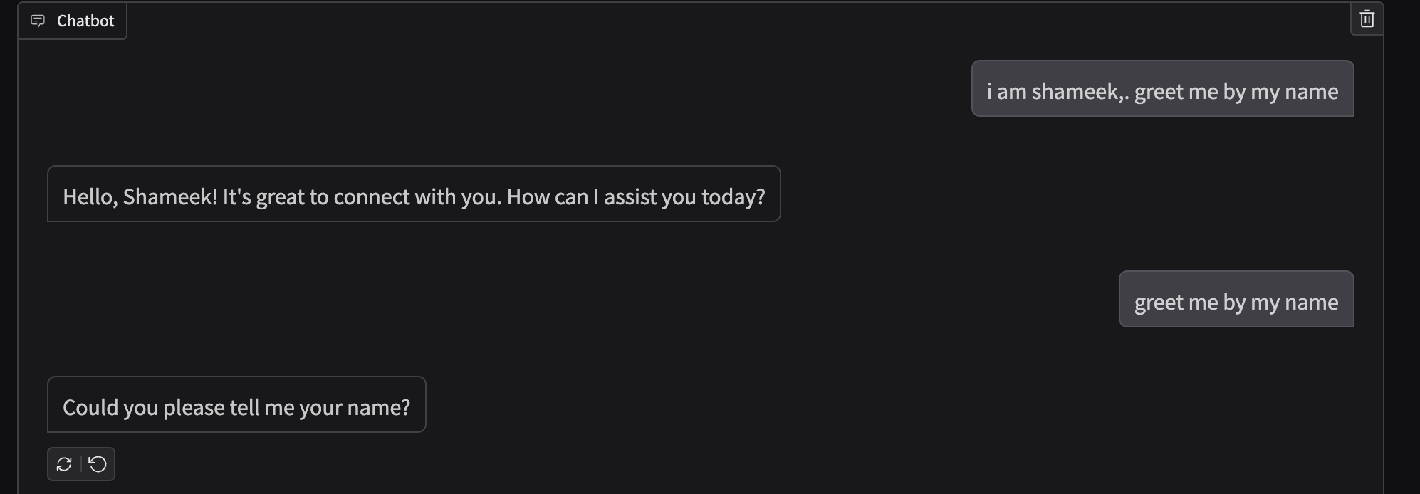 def chat(user_input: str, history): result = graph.invoke({"messages": [{"role": "user", "content": user_input}]}) return result["messages"][-1].content gr.ChatInterface(chat, type="messages").launch()