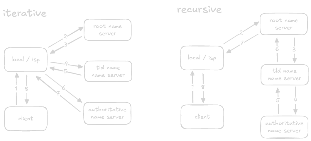 nslookup domain.comanddig domain.com - there are two ways the resolution can be performed - “iterative” and “recursive”. iterative is the one used to reduce the load on the actual dns infrastructure
